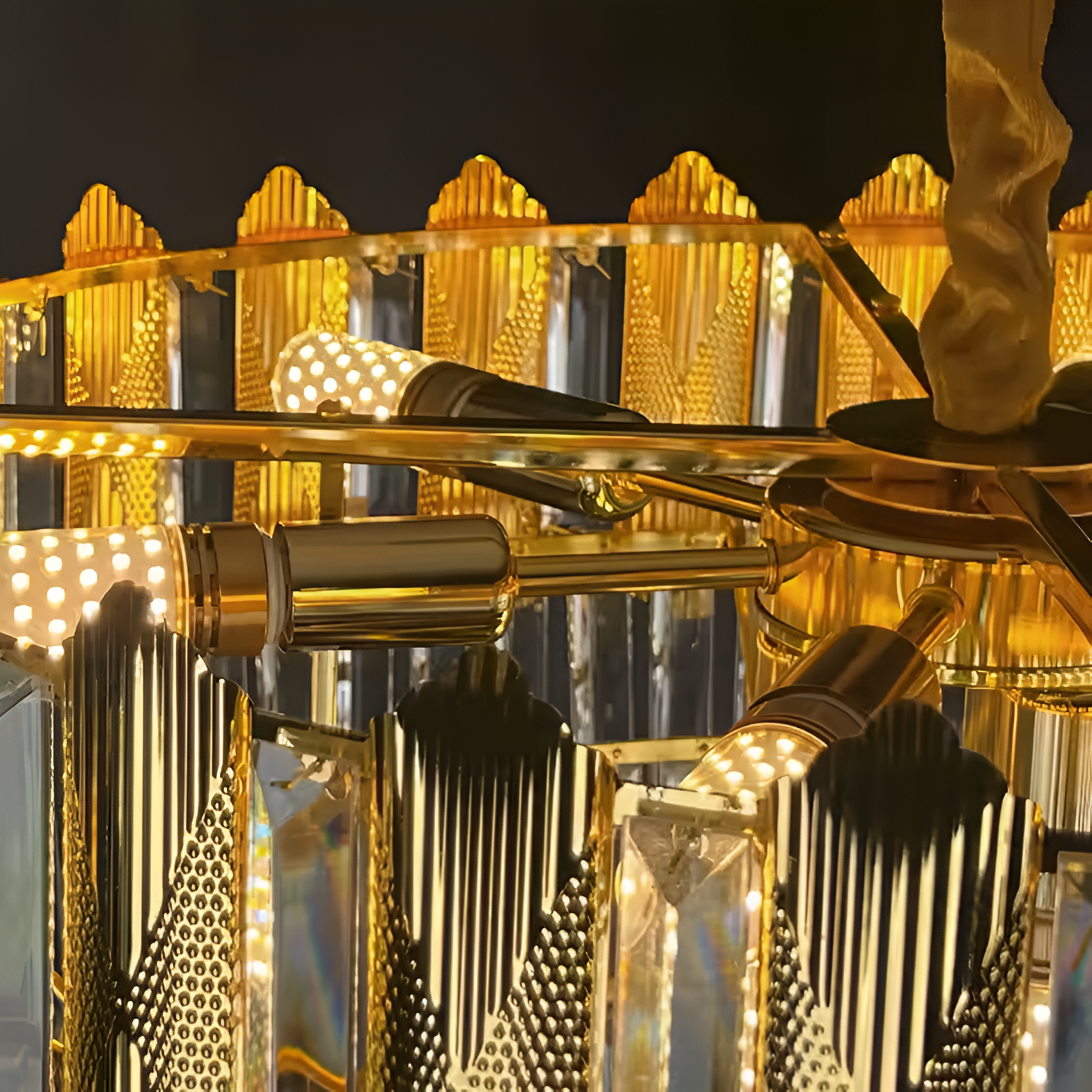 Creeaza un decor sofisticat si plin de farmec cu Candelabrul Cristal Hampton Eleganza, o piesa eleganta de iluminat care aduce luxul clasic in spatiile moderne. Designul sau impunator, completat de un finisaj auriu lucios si cristale atent finisate, transforma orice incapere intr-un loc memorabil.