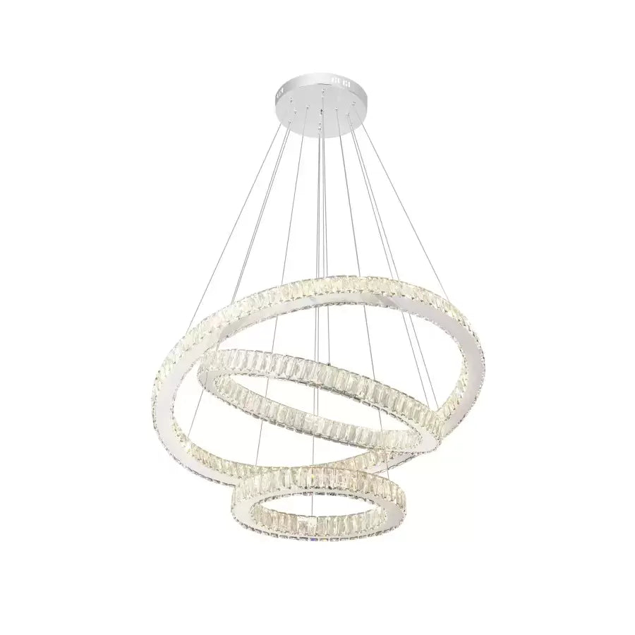 Lustra LED Cristal Cayden reprezintă o operă de artă a iluminatului și un punct de atracție în orice spațiu. Cu un design elegant în culoare argintie și trei cercuri dispuse în stil pendul, această lustră oferă nu doar iluminare puternică, ci și un aspect spectaculos.