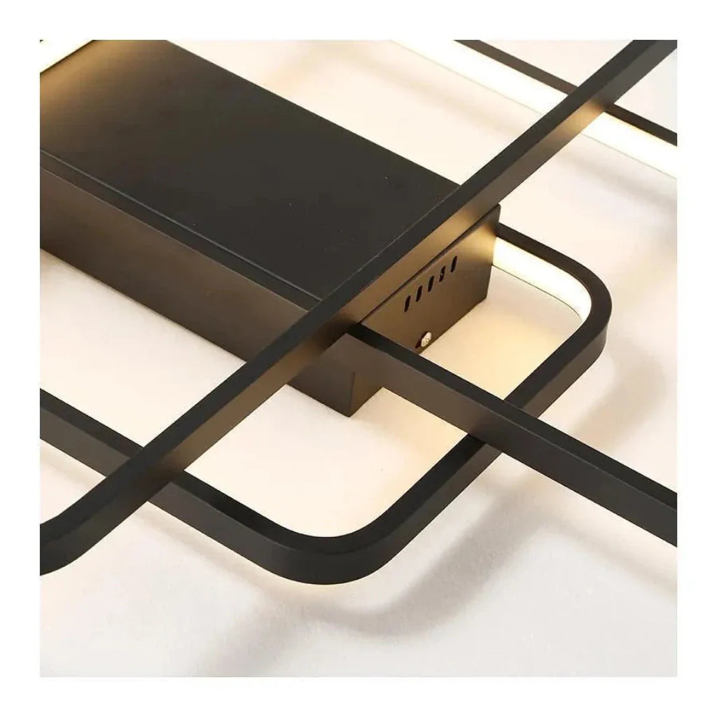 Descopera un design geometric artistic alcatuit din trei dreptunghiuri interconectate, care transforma aceasta lustra intr-o adevarata opera de arta contemporana. Finisajul negru mat ofera un contrast sofisticat cu lumina calda, creand un accent dramatic in designul interior al oricarei incaperi moderne.