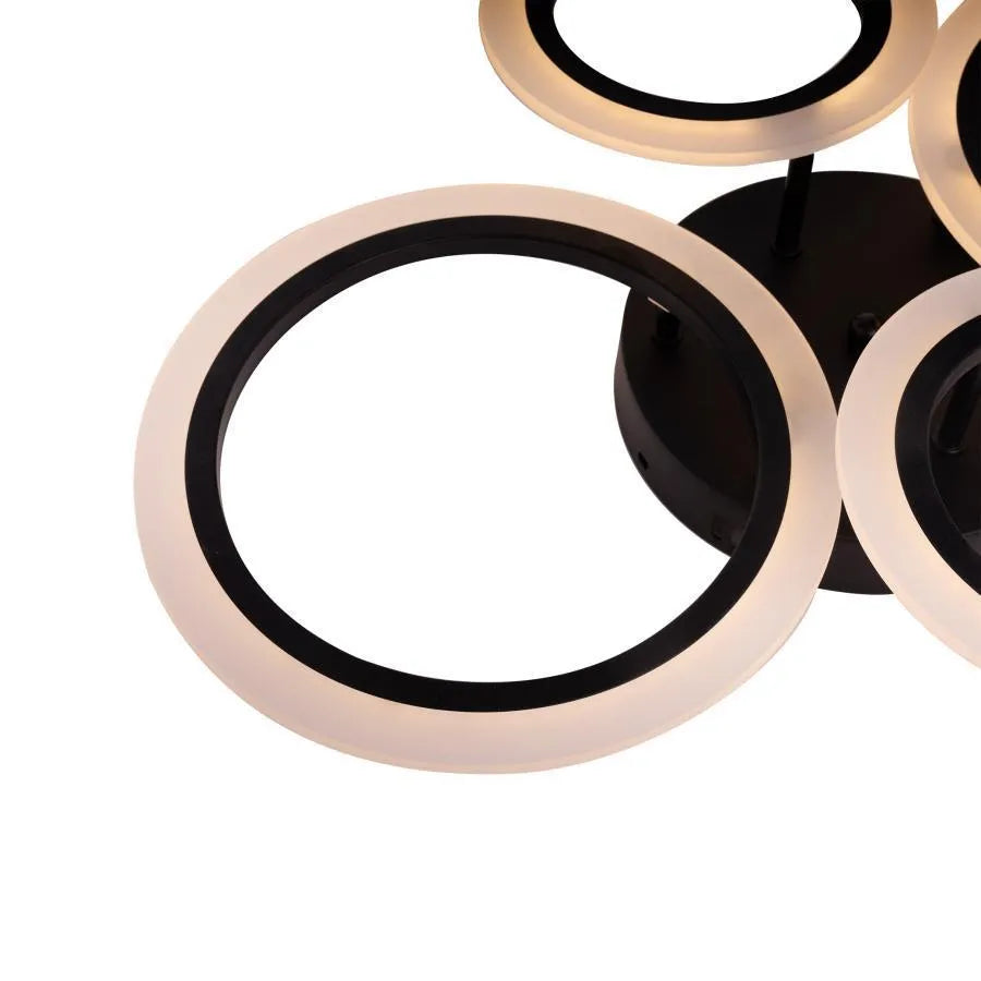 Cele patru cercuri, dispuse într-o manieră care creează un ansamblu vizual dinamic și echilibrat, sunt iluminate de LED-uri cu posibilitatea de a selecta temperatura culorii. Prin intermediul telecomenzii, poți alege între lumină rece (pentru un ambient energizant), caldă (pentru o atmosferă primitoare și relaxantă) sau neutră (pentru iluminare generală). Funcția de dimare îți permite să ajustezi intensitatea luminii pentru a se potrivi perfect oricărui moment.